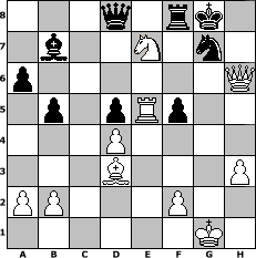 game notation in PGN-format [Event "Entdeckung der Langsamkeit III"] [Site "www.myChess.de"] [Date "2013.03.15"] [Round "1"] [White "reisinger"] [Black "Seneca"] [ECO "A42"] [WhitemyELO "1515"] [BlackmyELO "1530"] [Result "1-0"] [TimeControl "10/3456000"] [WhiteDays "160"] [BlackDays "142"] [MyChessNo "87092"] 1. d4 d6 2. c4 g6 3. Nc3 Nf6 4. Nf3 Bg7 5. h3 Nbd7 6. Bf4 c5 7. e3 cxd4 8. exd4 a6 9. Bd3 O-O 10. O-O b6 11. Qd2 Bb7 12. Nh2 Nh5 13. Bh6 Re8 14. Ng4 Ndf6 15. Nh2 Rc8 16. g4 Bxh6 17. Qxh6 Ng7 18. Rfe1 e6 19. Re3 Nd7 20. Be4 d5 21. cxd5 exd5 22. Bd3 Rxe3 23. Be2 Re6 24. Nf3 f6 25. Bd3 b5 26. g5 f5 27. Ne2 Nb6 28. Nf4 Re7 29. Ne5 Nc4 30. Nexg6 Rf7 31. Re1 Rcc7 32. Ne5 Nxe5 33. Rxe5 Rce7 34. g6 hxg6 35. Nxg6 Rf8 36. Nxe7+ 1-0 position notation in FEN-format 3q1rk1/1b2N1n1/p6Q/1p1pRp2/3P4/3B3P/PP3P2/6K1 - - - 0 36 Captured white pieces: Captured black pieces: Click on a captured piece in order to display the desired move!