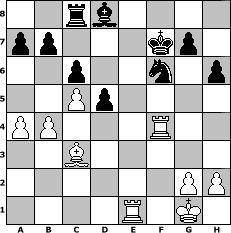 game notation in PGN-format [Event "1. Weltmeisterschaft @ myschach.de"] [Site "www.myChess.de"] [Date "2006.09.15"] [Round "2"] [White "ujack1961"] [Black "MartinSilies"] [ECO "C43"] [WhitemyELO "1774"] [BlackmyELO "1547"] [Result "1-0"] [TimeControl "10/2592000"] [WhiteDays "90"] [BlackDays "21"] [MyChessNo "28489"] 1. e4 e5 2. Nf3 Nf6 3. d4 Nxe4 4. dxe5 d5 5. Be2 Be6 6. Nbd2 Nxd2 7. Bxd2 Nd7 8. O-O Bc5 9. Bd3 O-O 10. Ng5 h6 11. Nxe6 fxe6 12. Qe2 c6 13. b4 Bb6 14. c4 Bc7 15. f4 Nb6 16. c5 Nd7 17. Qh5 Qe8 18. Bg6 Qe7 19. Rae1 Bd8 20. f5 exf5 21. Bc3 f4 22. e6 Nf6 23. Bf7+ Rxf7 24. exf7+ Qxf7 25. Qxf7+ Kxf7 26. Rxf4 Rc8 27. a4 1-0 position notation in FEN-format 2rb4/pp3kp1/2p2n1p/2Pp4/PP3R2/2B5/6PP/4R1K1 - - - 0 27 Captured white pieces: Captured black pieces: Click on a captured piece in order to display the desired move!