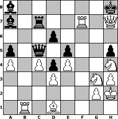 game notation in PGN-format [Event "Jahresende"] [Site "www.myChess.de"] [Date "2012.12.04"] [Round "1"] [White "Caligula"] [Black "Knight"] [Variant "Fischerrandom"] [SetUp "1"] [FEN "bbrnqknr/pppppppp/8/8/8/8/PPPPPPPP/BBRNQKNR w KQkq - 0 1"] [WhitemyELO "1393"] [BlackmyELO "1182"] [Result "1-0"] [TimeControl "10/864000"] [WhiteDays "10"] [BlackDays "10"] [MyChessNo "85288"] 1. c4 e5 2. e4 Nf6 3. Nf3 c5 4. b3 Nc6 5. d3 Nd4 6. Bxd4 cxd4 7. Qb4+ Kg8 8. Qd2 b6 9. Bc2 h6 10. O-O a6 11. Nh4 b5 12. a3 bxc4 13. bxc4 d6 14. f4 Ng4 15. f5 h5 16. h3 Nf6 17. Nf2 Qc6 18. Nh1 Kh7 19. Qd1 Kg8 20. Bb3 Qc5 21. Ra1 a5 22. a4 Qb4 23. Ng3 Ba7 24. Kh2 Qc5 25. Rc1 Qb4 26. Rb1 Qc5 27. Qd2 Rh6 28. Bd1 g6 29. Qxh6 Nh7 30. fxg6 fxg6 31. Qxg6+ Kh8 32. Rf7 Rc7 33. Qxh7# 1-0 position notation in FEN-format b6k/b1r2R1Q/3p4/p1q1p2p/P1PpP2N/3P2NP/6PK/1R1B4 - - - 0 33 Captured white pieces: Captured black pieces: Click on a captured piece in order to display the desired move!