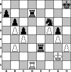 game notation in PGN-format [Event "Hitzeschlacht"] [Site "www.myChess.de"] [Date "2009.08.13"] [Round "1"] [White "BobbyF4"] [Black "beowulf"] [ECO "C21"] [WhitemyELO "1567"] [BlackmyELO "1368"] [Result "0-1"] [TimeControl "10/864000"] [WhiteDays "05"] [BlackDays "10"] [MyChessNo "58286"] 1. e4 e5 2. d4 d6 3. Bc4 Nc6 4. Nf3 Nf6 5. dxe5 dxe5 6. Nbd2 Bb4 7. c3 Ba5 8. Bxf7+ Kxf7 9. Qb3+ Ke7 10. Ng5 Qg8 11. Qa3+ Ke8 12. O-O h6 13. Ngf3 Qf8 14. Qa4 Bd7 15. Nh4 Bb6 16. Ng6 Qc5 17. Nb3 Qd6 18. Qc4 Be6 19. Qe2 Rg8 20. Rd1 Bc4 21. Qc2 Bxb3 22. axb3 Qe6 23. h3 Nd7 24. Nh4 Kf7 25. Rd3 Rgf8 26. Nf5 Ne7 27. Rf3 Nxf5 28. exf5 Qe7 29. b4 Kg8 30. Qb3+ Kh8 31. g4 g5 32. Bd2 c6 33. c4 Bd4 34. Be3 b6 35. Rd1 c5 36. Qd3 Rad8 37. b3 e4 38. Bxg5 hxg5 39. Qe2 Rf7 40. Rg3 Re8 41. b5 Nf6 42. Qd2 e3 43. fxe3 Bxe3+ 44. Rxe3 Qxe3+ 45. Qxe3 Rxe3 46. Kg2 Rd7 0-1 position notation in FEN-format 7k/p2r4/1p3n2/1Pp2Pp1/2P3P1/1P2r2P/6K1/3R4 - - - 2 47 Captured white pieces: Captured black pieces: Click on a captured piece in order to display the desired move!