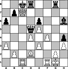 game notation in PGN-format [Event "Zum Vatertag"] [Site "www.myChess.de"] [Date "2017.05.27"] [Round "1"] [White "alpacino"] [Black "Hobbykegler"] [ECO "D02"] [WhitemyELO "1335"] [BlackmyELO "1033"] [Result "1-0"] [TimeControl "10/2592000"] [WhiteDays "78"] [BlackDays "63"] [MyChessNo "108358"] 1. d4 d5 2. Nf3 Nc6 3. e3 Bf5 4. Nc3 Qd6 5. Bd3 Be6 6. a3 O-O-O 7. Bd2 g6 8. Ne5 Nxe5 9. Nb5 Qd7 10. dxe5 a6 11. Nd4 Nh6 12. f3 Bg7 13. f4 Bg4 14. Be2 Bxe2 15. Qxe2 Nf5 16. Nxf5 gxf5 17. c3 Qc6 18. O-O h5 19. h3 h4 20. Rac1 Rhg8 21. Qd3 d4 22. cxd4 Qd5 23. Qxf5+ e6 24. Qxf7 Bh6 25. Qxc7# 1-0 position notation in FEN-format 2kr2r1/1pQ5/p3p2b/3qP3/3P1P1p/P3P2P/1P1B2P1/2R2RK1 - - - 0 25 Captured white pieces: Captured black pieces: Click on a captured piece in order to display the desired move!