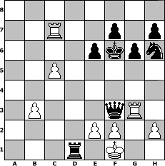 game notation in PGN-format [Event "Winterende2014"] [Site "www.myChess.de"] [Date "2014.03.06"] [Round "2"] [White "Haneken"] [Black "muellerh"] [ECO "B01"] [WhitemyELO "1037"] [BlackmyELO "1532"] [Result "0-1"] [TimeControl "10/1728000"] [WhiteDays "73"] [BlackDays "73"] [MyChessNo "93424"] 1. e4 d5 2. e5 e6 3. Bb5+ c6 4. Ba4 b5 5. Bb3 c5 6. d3 Bd7 7. Be3 c4 8. dxc4 dxc4 9. Qd2 cxb3 10. axb3 Nc6 11. Bf4 Qc7 12. Nc3 Bb4 13. Nf3 Rd8 14. Ra6 Bc8 15. Nxb5 Bxd2+ 16. Bxd2 Qd7 17. Ra4 Nxe5 18. Nbd4 Nxf3+ 19. Nxf3 Bb7 20. Rxa7 Qc8 21. Ba5 Bxf3 22. Bxd8 Qxd8 23. gxf3 Qd4 24. Ra8+ Ke7 25. Rg1 g6 26. c4 Qxb2 27. Kf1 Nh6 28. Ra7+ Kf6 29. Rb7 Rd8 30. c5 Qc3 31. Rc7 Qxf3 32. Rg3 Rd1# 0-1 position notation in FEN-format 8/2R2p1p/4pkpn/2P5/8/1P3qR1/4PP1P/3r1K2 - - - 2 33 Captured white pieces: Captured black pieces: Click on a captured piece in order to display the desired move!