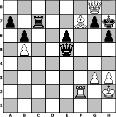 game notation in PGN-format [Event "?"] [Site "www.myChess.de"] [Date "2025.11.01"] [Round "?"] [White "Winston"] [Black "Lohl"] [ECO "B01"] [WhitemyELO "1539"] [BlackmyELO "1264"] [Result "1-0"] [TimeControl "10/2592000"] [WhiteDays "120"] [BlackDays "120"] [MyChessNo "133819"] 1. e4 d5 2. e5 Nc6 3. d4 Bf5 4. h3 e6 5. Nf3 Nge7 6. Bg5 Qd7 7. Nc3 Nb4 8. Rc1 h6 9. Bd2 Ng6 10. a3 Nc6 11. b4 Be7 12. b5 Na5 13. Nxd5 Qxd5 14. Bxa5 b6 15. Bd2 O-O 16. a4 c6 17. c4 Qd7 18. d5 cxd5 19. cxd5 Qxd5 20. Bc4 Qd8 21. O-O Nh4 22. Nxh4 Bxh4 23. Qe2 Rc8 24. Rcd1 Qe7 25. Rb1 Bxb1 26. Rxb1 Qa3 27. Bb4 Qxa4 28. Bxf8 Kxf8 29. Bd3 Qd4 30. Rf1 Bxf2+ 31. Rxf2 Rc1+ 32. Kh2 Rc8 33. Qf3 Rc7 34. Bg6 Qxe5+ 35. g3 Kg8 36. Bxf7+ Kh8 37. Qa8+ Kh7 38. Qg8# 1-0 position notation in FEN-format 6Q1/p1r2Bpk/1p2p2p/1P2q3/8/6PP/5R1K/8 - - - 4 38 Captured white pieces: Captured black pieces: Click on a captured piece in order to display the desired move!