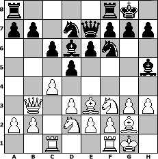game notation in PGN-format [Event "Gewitter im August"] [Site "www.myChess.de"] [Date "2006.08.13"] [Round "1"] [White "BirdofPray1"] [Black "Phantasos"] [ECO "A07"] [WhitemyELO "2122"] [BlackmyELO "2039"] [Result "1/2-1/2"] [TimeControl "10/864000"] [WhiteDays "18"] [BlackDays "18"] [MyChessNo "27637"] 1. Nf3 d5 2. g3 Bg4 3. Bg2 Nd7 4. c4 e6 5. Qb3 Nc5 6. Qc2 Nf6 7. O-O c6 8. d3 Bd6 9. Be3 Qe7 10. Nbd2 O-O 11. Rac1 Ncd7 12. h3 Bh5 13. Qb3 Nc5 14. Qc2 Ncd7 15. Qb3 1/2-1/2 position notation in FEN-format r4rk1/pp1nqppp/2pbpn2/3p3b/2P5/1Q1PBNPP/PP1NPPB1/2R2RK1 - - - 6 15 Captured white pieces: Captured black pieces: Click on a captured piece in order to display the desired move!