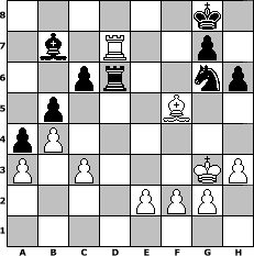 | game notation in PGN-format [Event "Skandinavisches Turnier"] [Site "www.myChess.de"] [Date "2013.05.06"] [Round "1"] [White "Knight"] [Black "Master1"] [ECO "B01"] [WhitemyELO "1267"] [BlackmyELO "1279"] [Result "1/2-1/2"] [TimeControl "10/2592000"] [WhiteDays "150"] [BlackDays "076"] [MyChessNo "88173"] 1. e4 d5 2. exd5 Qxd5 3. Nc3 Qd8 4. d4 Nf6 5. Bg5 e6 6. Nf3 Be7 7. Bb5+ c6 8. Ba4 O-O 9. O-O b5 10. Bb3 a5 11. a3 Nbd7 12. Re1 a4 13. Ba2 Rb8 14. d5 Nxd5 15. Bxe7 Nxe7 16. b4 h6 17. Nd4 Nf6 18. Nf3 Qxd1 19. Raxd1 Re8 20. Ne4 Nxe4 21. Rxe4 Bb7 22. Re3 Nf5 23. Red3 Ne7 24. Rd7 Ba8 25. Ne5 Bb7 26. Naf3 Nf5 27. Rc7 Rec8 28. Rdd7 Rxc7 29. Rxc7 Ba8 30. Ne5 Rd8 31. h3 Nd4 32. c3 Nf5 33. Rxf7 Nh4 34. Bxe6 Rd1+ 35. Kh2 Kh7 36. Kg3 Ng6 37. Bf5 Rd6 38. Nd7 Bb7 39. Nf8+ Kg8 40. Rd7 1/2-1/2 position notation in FEN-format 6k1/1b1R2p1/2pr2np/1p3B2/pP6/P1P3KP/4PPP1/8 - - - 12 40 Captured white pieces:                              Captured black pieces:                               Click on a captured piece in order to display the desired move!