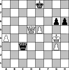 game notation in PGN-format [Event "F"] [Site "www.myChess.de"] [Date "2005.03.08"] [Round "1"] [White "Dragonwolves"] [Black "Devine"] [ECO "A58"] [WhitemyELO "1969"] [BlackmyELO "1600"] [Result "1/2-1/2"] [TimeControl "10/1728000"] [WhiteDays "115"] [BlackDays "116"] [MyChessNo "10995"] 1. d4 Nf6 2. c4 c5 3. d5 b5 4. cxb5 a6 5. bxa6 Bxa6 6. Nf3 d6 7. Nc3 g6 8. Nd2 Qa5 9. e4 Bxf1 10. Rxf1 Bg7 11. Nc4 Qb4 12. Qd3 Nbd7 13. a3 Qb7 14. f3 O-O 15. Qe2 Nb6 16. Rf2 Nfd7 17. Nxb6 Qxb6 18. Kf1 Rfb8 19. Nd1 e6 20. dxe6 fxe6 21. Qc4 Re8 22. Bf4 Ne5 23. Bxe5 Bxe5 24. Nc3 Bxh2 25. f4 Bg3 26. Rf3 Bh4 27. Rb1 Kg7 28. Rd3 Bf6 29. Nb5 Be7 30. g3 Rab8 31. a4 e5 32. Kg2 Rf8 33. Qc3 Qc6 34. Re1 Rfd8 35. fxe5 d5 36. Red1 dxe4 37. Rxd8 Rxd8 38. Rxd8 Bxd8 39. Nd4 Qb6 40. Qxc5 Qxb2+ 41. Kh3 Qd2 42. Ne6+ Kf7 43. Nxd8+ Qxd8 44. Qc4+ Ke7 45. Qxe4 Qd7+ 46. Qg4 Qd5 47. Qh4+ Ke8 48. Qf6 Qh1+ 49. Kg4 Qh5+ 50. Kf4 Qh6+ 51. Ke4 Qh1+ 52. Qf3 Qe1+ 53. Kf4 Qc1+ 54. Kg4 h6 55. Qd5 Qc2 56. Kf3 Qc3+ 57. Kg4 1/2-1/2 position notation in FEN-format 4k3/8/6pp/3QP3/P5K1/2q3P1/8/8 - - - 5 57 Captured white pieces: Captured black pieces: Click on a captured piece in order to display the desired move!