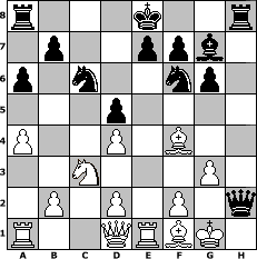 game notation in PGN-format [Event "Weihnachtsturnier 2012"] [Site "www.myChess.de"] [Date "2012.12.18"] [Round "1"] [White "Tomino"] [Black "Grubengeist"] [ECO "D11"] [WhitemyELO "1730"] [BlackmyELO "1956"] [Result "0-1"] [TimeControl "10/864000"] [WhiteDays "04"] [BlackDays "07"] [MyChessNo "85574"] 1. d4 d5 2. c4 c6 3. Nf3 dxc4 4. a4 Nf6 5. e3 Be6 6. Nc3 g6 7. Ng5 Bd5 8. e4 h6 9. exd5 hxg5 10. Bxc4 cxd5 11. Bb5+ Nc6 12. Bxg5 Bg7 13. O-O Qd6 14. g3 a6 15. Bf4 Qe6 16. Re1 Qh3 17. Bf1 Qxh2# 0-1 position notation in FEN-format r3k2r/1p2ppb1/p1n2np1/3p4/P2P1B2/2N3P1/1P1P1P1q/R2QRBK1 - kq - 0 18 Captured white pieces: Captured black pieces: Click on a captured piece in order to display the desired move!