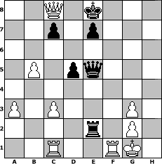 game notation in PGN-format [Event "Turnier zum Tag der deutschen Einheit"] [Site "www.myChess.de"] [Date "2010.10.04"] [Round "2"] [White "hape50"] [Black "Hobbykegler"] [ECO "D00"] [WhitemyELO "1341"] [BlackmyELO "1133"] [Result "1-0"] [TimeControl "10/1728000"] [WhiteDays "80"] [BlackDays "49"] [MyChessNo "68798"] 1. d4 d5 2. h3 Nc6 3. Nf3 Nf6 4. a3 Bf5 5. e3 Ne4 6. Bd3 g6 7. Bd2 Nxd2 8. Qxd2 Bg7 9. Nc3 O-O 10. Ne2 Bxd3 11. Qxd3 Qd6 12. Ng3 a5 13. O-O f5 14. Ng5 h6 15. Nf3 Ra6 16. b3 f4 17. exf4 Rxf4 18. c3 a4 19. b4 b5 20. Qxb5 Na7 21. Qd3 Nc8 22. Ne2 Re4 23. Ne5 Bxe5 24. dxe5 Qxe5 25. Qxa6 Rxe2 26. Qxc8+ Kg7 27. Rac1 g5 28. Qd7 h5 29. Qxa4 g4 30. hxg4 hxg4 31. b5 g3 32. Qg4+ Kf7 33. fxg3+ Ke8 34. Qc8# 1-0 position notation in FEN-format 2Q1k3/2p1p3/8/1P1pq3/8/P1P3P1/4r1P1/2R2RK1 - - - 2 34 Captured white pieces: Captured black pieces: Click on a captured piece in order to display the desired move!