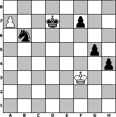 game notation in PGN-format [Event "10. HK-Turnier"] [Site "www.myChess.de"] [Date "2009.08.06"] [Round "2"] [White "Haneken"] [Black "Andreas"] [ECO "A00"] [WhitemyELO "1534"] [BlackmyELO "1540"] [Result "0-1"] [TimeControl "10/2592000"] [WhiteDays "30"] [BlackDays "30"] [MyChessNo "58088"] 1. Nc3 e5 2. e3 d5 3. Nf3 Bg4 4. h3 Bh5 5. g4 e4 6. gxh5 exf3 7. Qxf3 Nf6 8. Bg2 c6 9. d4 Bb4 10. Bd2 Nbd7 11. O-O-O Bxc3 12. Bxc3 Ne4 13. Bb4 Ng5 14. Qf4 Ne6 15. Qf5 a5 16. Bc3 Qf6 17. Qxf6 Nxf6 18. h6 g6 19. f3 Nh5 20. Rhg1 Ng3 21. Rge1 Kd7 22. Kb1 b5 23. e4 Nf4 24. Rd2 b4 25. exd5 Nxd5 26. f4 bxc3 27. Rd3 Rae8 28. Rxe8 Rxe8 29. bxc3 Ne4 30. Bxe4 Rxe4 31. Rf3 Re3 32. Rxe3 Nxe3 33. a4 Nd5 34. c4 Nxf4 35. Kb2 Nxh3 36. Kc3 Nf2 37. d5 cxd5 38. cxd5 Ng4 39. Kc4 Nxh6 40. Kb5 Nf5 41. Kxa5 Nd6 42. Kb6 Nc8+ 43. Kc5 h5 44. Kd4 h4 45. Ke3 g5 46. Kf3 Nb6 47. a5 Nxd5 48. a6 Nb6 49. c4 Nxc4 50. a7 Nb6 0-1 position notation in FEN-format 8/P2k1p2/1n6/6p1/7p/5K2/8/8 - - - 1 51 Captured white pieces: Captured black pieces: Click on a captured piece in order to display the desired move!