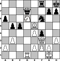 game notation in PGN-format [Event "Oktoberrevolution"] [Site "www.myChess.de"] [Date "2004.09.26"] [Round "1"] [White "Kaiservd"] [Black "Sanji"] [ECO "B30"] [WhitemyELO "1468"] [BlackmyELO "1435"] [Result "1-0"] [TimeControl "10/864000"] [WhiteDays "10"] [BlackDays "09"] [MyChessNo "7060"] 1. e4 c5 2. Nf3 Nc6 3. b3 d6 4. Bb2 e6 5. d4 cxd4 6. Nxd4 Nxd4 7. Qxd4 e5 8. Qe3 f5 9. Nd2 Nf6 10. Bd3 f4 11. Qf3 Bg4 12. Bb5+ Bd7 13. Bxd7+ Qxd7 14. O-O Be7 15. Rac1 O-O 16. c4 Rac8 17. Rfd1 a6 18. h3 Kh8 19. c5 Rxc5 20. Rxc5 dxc5 21. Bxe5 Bd6 22. Nc4 b5 23. Nxd6 1-0 position notation in FEN-format 5r1k/3q2pp/p2N1n2/1pp1B3/4Pp2/1P3Q1P/P3PPP1/3R2K1 - - - 0 23 Captured white pieces: Captured black pieces: Click on a captured piece in order to display the desired move!