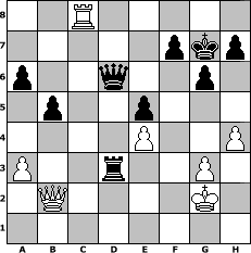 game notation in PGN-format [Event "YOU\'RE HERE BUT I AM NOT"] [Site "www.myChess.de"] [Date "2019.03.10"] [Round "1"] [White "iamnothere"] [Black "Joschi"] [ECO "A01"] [WhitemyELO "1512"] [BlackmyELO "1583"] [Result "0-1"] [TimeControl "10/2592000"] [WhiteDays "145"] [BlackDays "150"] [MyChessNo "114519"] 1. b3 d5 2. e3 e5 3. Bb2 Bd6 4. Nf3 Qe7 5. Be2 Nf6 6. O-O O-O 7. d3 c5 8. Nbd2 Nc6 9. e4 d4 10. Nc4 b5 11. Nxd6 Qxd6 12. a3 Bg4 13. c4 dxc3 14. Bxc3 Bxf3 15. Bxf3 Rfd8 16. Be2 a6 17. h3 Nd4 18. Bxd4 Qxd4 19. Qc2 Rac8 20. Rfd1 Nd7 21. Rab1 Nf8 22. g3 Ne6 23. Kg2 Qd6 24. Bg4 Rc6 25. Bxe6 Qxe6 26. Qc3 Rd4 27. Rb2 Qd6 28. Rbd2 Qc7 29. h4 Rcd6 30. b4 Rc6 31. bxc5 Rxc5 32. Qb3 Rc3 33. Qb2 Qc5 34. Ra1 Rdxd3 35. Rxd3 Rxd3 36. f3 Qd6 37. Kg1 Rxf3 38. Rc1 g6 39. Rc8+ Kg7 40. Kg2 Rd3 0-1 position notation in FEN-format 2R5/5pkp/p2q2p1/1p2p3/4P2P/P2r2P1/1Q4K1/8 - - - 4 41 Captured white pieces: Captured black pieces: Click on a captured piece in order to display the desired move!