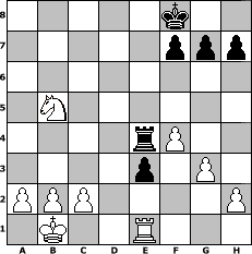game notation in PGN-format [Event "Albspiele 11"] [Site "www.myChess.de"] [Date "2011.02.24"] [Round "1"] [White "beowulf"] [Black "Steppenwolf"] [ECO "A36"] [WhitemyELO "1419"] [BlackmyELO "1160"] [Result "1-0"] [TimeControl "10/1728000"] [WhiteDays "20"] [BlackDays "20"] [MyChessNo "72272"] 1. c4 c5 2. Nc3 Nc6 3. g3 e5 4. Bg2 Nf6 5. d3 d5 6. Bg5 Be7 7. cxd5 Nxd5 8. Bxe7 Ncxe7 9. Nxd5 Nxd5 10. e3 Bf5 11. e4 Be6 12. exd5 Bxd5 13. Bxd5 Qxd5 14. Qf3 Rd8 15. Qxd5 Rxd5 16. O-O-O O-O 17. Nf3 Re8 18. Rhe1 b5 19. d4 e4 20. dxc5 Rxc5+ 21. Kb1 Kf8 22. Nd4 a5 23. Nb3 Rc6 24. Nxa5 Rc5 25. Nb3 Rc4 26. Rd4 Rxd4 27. Nxd4 Re5 28. f3 e3 29. f4 Re4 30. Nxb5 1-0 position notation in FEN-format 5k2/5ppp/8/1N6/4rP2/4p1P1/PPP4P/1K2R3 - - - 0 30 Captured white pieces: Captured black pieces: Click on a captured piece in order to display the desired move!