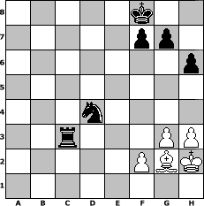 game notation in PGN-format [Event "unter uns Nr. 25 Adventturnier"] [Site "www.myChess.de"] [Date "2014.11.29"] [Round "1"] [White "Master1"] [Black "Gauss1233"] [ECO "A46"] [WhitemyELO "1401"] [BlackmyELO "1411"] [Result "0-1"] [TimeControl "10/864000"] [WhiteDays "29"] [BlackDays "30"] [MyChessNo "96872"] 1. d4 Nf6 2. Nf3 d5 3. g3 e6 4. Bg2 c5 5. O-O h6 6. Nc3 a6 7. e3 b5 8. e4 Nc6 9. exd5 exd5 10. Re1+ Be7 11. a3 c4 12. Be3 O-O 13. Rb1 Bd6 14. h3 Re8 15. Kh1 Rb8 16. Ne2 a5 17. c3 b4 18. axb4 axb4 19. Bd2 bxc3 20. Bxc3 Bf5 21. Neg1 Bxb1 22. Qxb1 Rxe1 23. Qxe1 Qe7 24. Qxe7 Bxe7 25. Ne2 Ne4 26. Kg1 Nxc3 27. Nxc3 Rd8 28. Kf1 Bf6 29. Ne2 Rb8 30. Kg1 Rxb2 31. Nc3 Bxd4 32. Nxd4 Nxd4 33. Nxd5 Rb1+ 34. Kh2 Rb3 35. Ne7+ Kf8 36. Nd5 c3 37. Nxc3 Rxc3 0-1 position notation in FEN-format 5k2/5pp1/7p/8/3n4/2r3PP/5PBK/8 - - - 0 38 Captured white pieces: Captured black pieces: Click on a captured piece in order to display the desired move!
