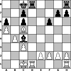 game notation in PGN-format [Event "Wildes Gemetzel Teil 2"] [Site "www.myChess.de"] [Date "2005.03.10"] [Round "1"] [White "HPB2005"] [Black "GIM1961"] [ECO "C43"] [WhitemyELO "2002"] [BlackmyELO "1997"] [Result "1/2-1/2"] [TimeControl "10/2592000"] [WhiteDays "30"] [BlackDays "26"] [MyChessNo "11058"] 1. e4 e5 2. Nf3 Nf6 3. d4 exd4 4. e5 Ne4 5. Qxd4 d5 6. exd6 Nxd6 7. Nc3 Nc6 8. Qf4 Bf5 9. Bb5 Qe7+ 10. Be3 Nxb5 11. Nxb5 Qb4+ 12. Qxb4 Bxb4+ 13. c3 Ba5 14. b4 Bd3 15. a4 a6 16. Nbd4 Bb6 17. Nxc6 bxc6 18. O-O-O O-O-O 19. Nd4 Bc4 20. a5 Bxd4 21. Bxd4 f6 22. Bc5 1/2-1/2 position notation in FEN-format 2kr3r/2p3pp/p1p2p2/P1B5/1Pb5/2P5/4PPPP/2KR3R - - - 1 22 Captured white pieces: Captured black pieces: Click on a captured piece in order to display the desired move!