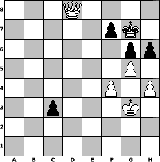 game notation in PGN-format [Event "around 1510"] [Site "www.myChess.de"] [Date "2005.03.07"] [Round "1"] [White "Seneca"] [Black "rikilatic"] [ECO "C23"] [WhitemyELO "1549"] [BlackmyELO "1497"] [Result "1-0"] [TimeControl "10/864000"] [WhiteDays "10"] [BlackDays "00"] [MyChessNo "10950"] 1. e4 e5 2. Bc4 Qf6 3. Nc3 Bc5 4. Nf3 Nc6 5. Nd5 Qd6 6. c3 Nge7 7. Nxe7 Qxe7 8. O-O d6 9. d4 Bb6 10. Be3 exd4 11. Nxd4 Nxd4 12. Bxd4 Bxd4 13. Qxd4 O-O 14. Rae1 c5 15. Qd2 a6 16. a4 Bd7 17. b3 b5 18. axb5 axb5 19. Bd5 Ra6 20. Re3 Rb8 21. Rf3 Be6 22. Re1 Bxd5 23. exd5 Qd7 24. Qe2 Rba8 25. Re3 Kf8 26. h3 g6 27. Qf3 Ra3 28. c4 bxc4 29. bxc4 Rxe3 30. Rxe3 Ra4 31. Qf6 Kg8 32. Re7 Ra1+ 33. Kh2 Qxe7 34. Qxe7 Ra6 35. g4 Kg7 36. h4 h6 37. Kg3 Ra4 38. Qxd6 Rxc4 39. Qe5+ Kg8 40. d6 Rc1 41. d7 Rd1 42. Qe8+ Kg7 43. d8=Q Rxd8 44. Qxd8 c4 45. f4 c3 46. g5 1-0 position notation in FEN-format 3Q4/5pk1/6pp/6P1/5P1P/2p3K1/8/8 - - - 0 46 Captured white pieces: Captured black pieces: Click on a captured piece in order to display the desired move!