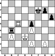 game notation in PGN-format [Event "Winter 2011/12"] [Site "www.myChess.de"] [Date "2011.12.22"] [Round "1"] [White "muetoe"] [Black "deepsabel"] [ECO "C63"] [WhitemyELO "1782"] [BlackmyELO "1984"] [Result "1/2-1/2"] [TimeControl "10/2592000"] [WhiteDays "59"] [BlackDays "75"] [MyChessNo "78352"] 1. e4 e5 2. Nf3 Nc6 3. Bb5 f5 4. d3 fxe4 5. dxe4 Nf6 6. O-O Bc5 7. Nc3 d6 8. Be3 Bb6 9. Qd3 O-O 10. Qc4+ Kh8 11. Rfe1 Nd4 12. Nxd4 exd4 13. Bxd4 c6 14. Ba4 Ng4 15. Nd1 Qh4 16. h3 Nxf2 17. Nxf2 Rxf2 18. Bxb6 axb6 19. Qd4 Rf4 20. Rf1 Bxh3 21. Rxf4 Qxf4 22. Rf1 Qg3 23. Rf2 Be6 24. Rf3 Qe5 25. Qxe5 dxe5 26. Bb3 Bxb3 27. Rxb3 b5 28. c4 Ra5 29. cxb5 Rxb5 30. Rd3 h6 31. b3 Ra5 32. a4 b5 33. axb5 Rxb5 34. Rc3 c5 35. Kf2 Kg8 36. Ke3 Kf7 37. Kd3 Rb4 38. Rxc5 1/2-1/2 position notation in FEN-format 8/5kp1/7p/2R1p3/1r2P3/1P1K4/4P1P1/8 - - - 0 38 Captured white pieces: Captured black pieces: Click on a captured piece in order to display the desired move!