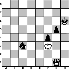 game notation in PGN-format [Event "unter uns Nr. 30 (Weihnachtsturnier)"] [Site "www.myChess.de"] [Date "2015.12.21"] [Round "2"] [White "Achimkogge"] [Black "Mattheus"] [ECO "A45"] [WhitemyELO "1493"] [BlackmyELO "1163"] [Result "1/2-1/2"] [TimeControl "10/2592000"] [WhiteDays "121"] [BlackDays "146"] [MyChessNo "101781"] 1. d4 Nf6 2. d5 c6 3. dxc6 Nxc6 4. Nf3 e5 5. c3 Bc5 6. Bg5 O-O 7. e4 h6 8. Be3 d5 9. Bxc5 Re8 10. Bb5 Nxe4 11. Be3 Bg4 12. Nbd2 Nxd2 13. Qxd2 Bxf3 14. gxf3 Qf6 15. Qxd5 Rad8 16. Qe4 Qd6 17. O-O Re6 18. Kh1 Rf6 19. Rg1 Ne7 20. Bxa7 b6 21. Qe2 Nf5 22. Rg4 Kh7 23. Rag1 g5 24. Bd3 Qxd3 25. Qxd3 Rxd3 26. Re4 Rxf3 27. Re2 Nh4 28. Rf1 e4 29. Rxe4 Rxf2 30. Rxf2 Rxf2 31. Kg1 Rxb2 32. a4 Nf3+ 33. Kf1 Nd2+ 34. Ke2 Nxe4+ 35. Kd3 f5 36. Bb8 h5 37. Bc7 Nc5+ 38. Ke3 f4+ 39. Kf3 Rxh2 40. Bxb6 Nxa4 41. Bg1 Rh3+ 42. Ke4 Nxc3+ 43. Kf5 Kh6 44. Bd4 Rg3 45. Bf2 h4 46. Bxg3 hxg3 47. Kg4 g2 48. Kf3 g1=Q 1/2-1/2 position notation in FEN-format 8/8/7k/6p1/5p2/2n2K2/8/6q1 - - - 0 49 Captured white pieces: Captured black pieces: Click on a captured piece in order to display the desired move!