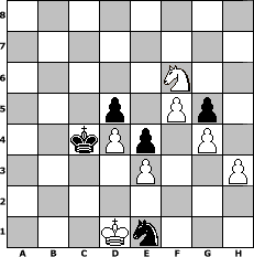 game notation in PGN-format [Event "Spass am Schach"] [Site "www.myChess.de"] [Date "2004.03.24"] [Round "1"] [White "Zoltan"] [Black "amsoft"] [ECO "D06"] [WhitemyELO "1649"] [BlackmyELO "1568"] [Result "1-0"] [TimeControl "10/864000"] [WhiteDays "68"] [BlackDays "28"] [MyChessNo "3266"] 1. d4 d5 2. c4 Nf6 3. Nc3 e6 4. Nf3 Be7 5. Bf4 c6 6. e3 O-O 7. Qc2 Nbd7 8. h3 a6 9. Rd1 dxc4 10. Bxc4 b5 11. Be2 Bb7 12. a3 Nd5 13. Nxd5 cxd5 14. Bc7 Qc8 15. Rc1 Nf6 16. O-O Ne4 17. Bf4 Bd6 18. Ne5 Qxc2 19. Rxc2 Rac8 20. Rfc1 Rxc2 21. Rxc2 Rc8 22. Bd3 Rxc2 23. Bxc2 Nd2 24. Nd3 Bxf4 25. Nxf4 Nc4 26. Nd3 f6 27. Kf1 e5 28. a4 e4 29. Nc5 Bc8 30. b3 Nd6 31. Bd1 bxa4 32. Nxa4 a5 33. Nb6 Bb7 34. f4 Kf7 35. Be2 Ke6 36. g4 g5 37. f5+ Ke7 38. Na4 Kd8 39. Nc5 Bc8 40. Kf2 Ke7 41. Ba6 Bxa6 42. Nxa6 Nb5 43. Ke2 Kd6 44. Nc5 h6 45. Nb7+ Kc7 46. Nxa5 Kb6 47. b4 Nc7 48. Kd2 Na6 49. Kc3 Nc7 50. Nb3 Na6 51. Nc5 Nb8 52. Kb3 Kb5 53. Ne6 Na6 54. Nd8 Nxb4 55. Nf7 Nd3 56. Nxh6 Nc1+ 57. Kc2 Kc4 58. Ng8 Nd3 59. Nxf6 Ne1+ 60. Kd1 1-0 position notation in FEN-format 8/8/5N2/3p1Pp1/2kPp1P1/4P2P/8/3Kn3 - - - 2 60 Captured white pieces: Captured black pieces: Click on a captured piece in order to display the desired move!