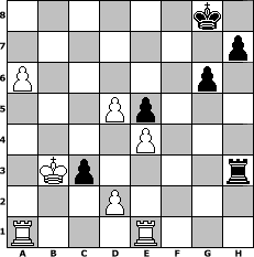game notation in PGN-format [Event "Cafehausturnier f"] [Site "www.myChess.de"] [Date "2009.05.12"] [Round "1"] [White "rikilatic"] [Black "rux"] [ECO "A57"] [WhitemyELO "1492"] [BlackmyELO "1452"] [Result "1-0"] [TimeControl "10/864000"] [WhiteDays "10"] [BlackDays "10"] [MyChessNo "55651"] 1. d4 Nf6 2. c4 c5 3. d5 b5 4. cxb5 a6 5. Nc3 axb5 6. e4 b4 7. Nb5 d6 8. Bc4 Nbd7 9. f3 Ne5 10. Be2 Qb6 11. Bg5 c4 12. Nd4 Nd3+ 13. Bxd3 Qxd4 14. Bxf6 exf6 15. Be2 Qxd1+ 16. Kxd1 Ba6 17. b3 c3 18. Bxa6 Rxa6 19. Ne2 g6 20. Nd4 Ra7 21. Nc6 Rb7 22. Kc2 Bg7 23. a3 f5 24. Nxb4 fxe4 25. Rhe1 f5 26. fxe4 f4 27. Nd3 Be5 28. b4 O-O 29. a4 f3 30. gxf3 Rxf3 31. a5 Rxb4 32. Nxb4 Rf2+ 33. Kb3 Rxh2 34. Nc6 Rh3 35. Nxe5 dxe5 36. a6 1-0 position notation in FEN-format 6k1/7p/P5p1/3Pp3/4P3/1Kp4r/3P4/R3R3 - - - 0 36 Captured white pieces: Captured black pieces: Click on a captured piece in order to display the desired move!