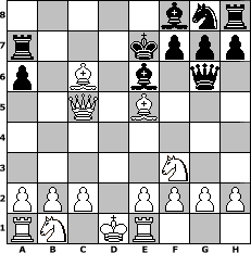 game notation in PGN-format [Event "K"] [Site "www.myChess.de"] [Date "2004.04.28"] [Round "1"] [White "doctordot2004"] [Black "Juri"] [ECO "C41"] [WhitemyELO "1487"] [BlackmyELO "1453"] [Result "1-0"] [TimeControl "10/3456000"] [WhiteDays "80"] [BlackDays "80"] [MyChessNo "4225"] 1. e4 e5 2. Nf3 d6 3. d4 exd4 4. Qxd4 c5 5. Qa4+ Nc6 6. Kd1 a6 7. Bf4 Qf6 8. e5 dxe5 9. Bxe5 b5 10. Bxb5 Qg6 11. Bxc6+ Ke7 12. Re1 Be6 13. Qa5 Ra7 14. Qxc5+ 1-0 position notation in FEN-format 5bnr/r3kppp/p1B1b1q1/2Q1B3/8/5N2/PPP1PPPP/RN1KR3 - - - 0 14 Captured white pieces: ![]() ![]() ![]() ![]() ![]() ![]() ![]() ![]() ![]() ![]() ![]() ![]() ![]() ![]() ![]() Captured black pieces: ![]() ![]() ![]() ![]() ![]() ![]() ![]() ![]() ![]() ![]() ![]() ![]() ![]() ![]() ![]() Click on a captured piece in order to display the desired move!