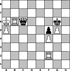 game notation in PGN-format [Event "Schwabenpfeil"] [Site "www.myChess.de"] [Date "2009.11.30"] [Round "1"] [White "nogumo"] [Black "werderfan"] [ECO "A00"] [WhitemyELO "1581"] [BlackmyELO "1521"] [Result "1-0"] [TimeControl "10/2592000"] [WhiteDays "21"] [BlackDays "29"] [MyChessNo "61064"] 1. b4 e5 2. Bb2 d6 3. e3 Nf6 4. Nf3 Bg4 5. Be2 Be7 6. O-O O-O 7. c4 Nbd7 8. h3 Bh5 9. Nc3 e4 10. Nd4 Bxe2 11. Qxe2 Ne5 12. Nf5 Nd3 13. Ba3 d5 14. cxd5 Bxb4 15. Nxe4 Nxe4 16. Qxd3 Bxa3 17. Qxa3 Nxd2 18. Rfd1 Nc4 19. Qc3 Qg5 20. Qxc4 Qxf5 21. Qxc7 Rfc8 22. Qxb7 Rab8 23. Qxa7 Rb2 24. Rf1 g5 25. Qd4 Rcc2 26. e4 Qf4 27. Rad1 g4 28. d6 Rd2 29. Qxb2 Rxb2 30. d7 Rb8 31. d8=Q+ Rxd8 32. Rxd8+ Kg7 33. hxg4 Qxe4 34. f3 Qe3+ 35. Kh1 Qh6+ 36. Kg1 Qe3+ 37. Kh2 Qh6+ 38. Kg3 Qb6 39. Rdd1 Qb2 40. a4 h5 41. gxh5 Qe5+ 42. f4 Qxh5 43. Ra1 Qg6+ 44. Kh2 Qh6+ 45. Kg1 Qb6+ 46. Rf2 Qd4 47. Ra3 Qd1+ 48. Kh2 Qh5+ 49. Rh3 Qa5 50. Ra2 Kg6 51. g4 f5 52. g5 Qb4 53. Rf3 Qe4 54. Kg2 Qc4 55. Rff2 Qe4+ 56. Kh2 Qc4 57. a5 Qa6 58. Rfb2 Qc4 59. Kg3 Qc3+ 60. Kh4 Qc4 61. Kg3 Qc3+ 62. Kh4 Qe1+ 63. Rf2 Qh1+ 64. Kg3 Qg1+ 65. Kf3 Qd1+ 66. Ke3 Qc1+ 67. Kd4 Qd1+ 68. Kc5 Qc1+ 69. Kb5 Qb1+ 70. Rab2 Qd3+ 71. Kb6 Qd4+ 72. Ka6 Qc4+ 73. Rb5 Qc6+ 74. Rb6 1-0 position notation in FEN-format 8/8/KRq3k1/P4pP1/5P2/8/5R2/8 - - - 34 74 Captured white pieces: Captured black pieces: Click on a captured piece in order to display the desired move!