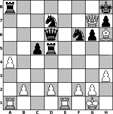 game notation in PGN-format [Event "Gedenkturnier f"] [Site "www.myChess.de"] [Date "2016.02.01"] [Round "1"] [White "martinus"] [Black "Joschi"] [ECO "A57"] [WhitemyELO "1803"] [BlackmyELO "1544"] [Result "1-0"] [TimeControl "10/2592000"] [WhiteDays "87"] [BlackDays "90"] [MyChessNo "102347"] 1. d4 Nf6 2. c4 c5 3. d5 b5 4. cxb5 a6 5. e3 g6 6. Nf3 Bg7 7. Nc3 axb5 8. Bxb5 O-O 9. O-O d6 10. h3 Nbd7 11. Re1 Ba6 12. Bc6 Rb8 13. e4 Bb7 14. a4 Bxc6 15. dxc6 Nb6 16. Nb5 Qc8 17. e5 dxe5 18. Nxe5 Rd8 19. Qe2 Rd5 20. c7 Ra8 21. Nc6 Bf8 22. Nxe7+ Bxe7 23. Qxe7 Nbd7 24. Nd6 Qxc7 25. Qxf7+ Kh8 26. Bh6 Qxd6 27. Qg7# 1-0 position notation in FEN-format r6k/3n2Qp/3q1npB/2pr4/P7/7P/1P1P1PP1/R3R1K1 - - - 1 27 Captured white pieces: Captured black pieces: Click on a captured piece in order to display the desired move!