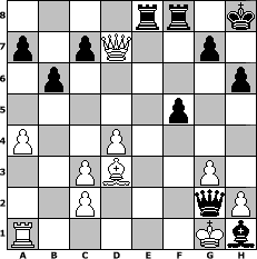 game notation in PGN-format [Event "und immer wieder Schach !"] [Site "www.myChess.de"] [Date "2009.11.06"] [Round "1"] [White "commander"] [Black "Naunhofer"] [ECO "A45"] [WhitemyELO "1158"] [BlackmyELO "1590"] [Result "0-1"] [TimeControl "10/864000"] [WhiteDays "18"] [BlackDays "30"] [MyChessNo "60436"] 1. d4 Nf6 2. Nc3 d5 3. f3 e6 4. e4 Bb4 5. Bg5 h6 6. Bxf6 Bxc3+ 7. bxc3 Qxf6 8. a4 dxe4 9. fxe4 Qh4+ 10. Kd2 Qxe4 11. Nf3 O-O 12. Bd3 Qf4+ 13. Ke1 b6 14. Qe2 Bb7 15. Ne5 Nc6 16. g3 Qg5 17. Qe4 f5 18. Qe2 Nxe5 19. Qxe5 Bxh1 20. Qxe6+ Kh8 21. Kf2 Rae8 22. Qd7 Qd2+ 23. Kg1 Qg2# 0-1 position notation in FEN-format 4rr1k/p1pQ2p1/1p5p/5p2/P2P4/2PB2P1/2P3qP/R5Kb - - - 7 24 Captured white pieces: Captured black pieces: Click on a captured piece in order to display the desired move!