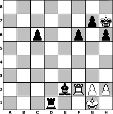 game notation in PGN-format [Event " Fluegel Gambit"] [Site "www.myChess.de"] [Date "2005.12.13"] [Round "1"] [White "Juri"] [Black "nogumo"] [ECO "B20"] [WhitemyELO "1680"] [BlackmyELO "1893"] [Result "0-1"] [TimeControl "10/2592000"] [WhiteDays "117"] [BlackDays "111"] [MyChessNo "20661"] 1. e4 c5 2. b4 cxb4 3. a3 d5 4. exd5 Qxd5 5. Bb2 e5 6. Qh5 Nc6 7. c4 Qe6 8. Nf3 Nf6 9. Qg5 h6 10. Qe3 Bd6 11. d4 exd4 12. Bxd4 Nxd4 13. Nxd4 Qxe3+ 14. fxe3 O-O 15. Nb5 Be5 16. Ra2 Bf5 17. Nd2 a6 18. Nd4 Bxd4 19. exd4 bxa3 20. Rxa3 Rfe8+ 21. Be2 Re7 22. Nf3 Rae8 23. Ne5 Nd7 24. O-O Bh7 25. Nxd7 Rxe2 26. Ne5 f6 27. Nf3 Rc2 28. c5 Ree2 29. Ne1 Rcd2 30. c6 bxc6 31. Rxa6 Be4 32. Ra8+ Kh7 33. Re8 Rxd4 34. Nf3 Bxf3 35. Rxe2 Bxe2 36. Rf5 Rd5 37. Rf2 Rd1+ 0-1 position notation in FEN-format 8/6pk/2p2p1p/8/8/8/4bRPP/3r2K1 - - - 4 38 Captured white pieces: Captured black pieces: Click on a captured piece in order to display the desired move!