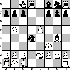 game notation in PGN-format [Event "PUNSCH-Turnier"] [Site "www.myChess.de"] [Date "2010.10.18"] [Round "1"] [White "Joschi"] [Black "pepo47"] [ECO "B01"] [WhitemyELO "1619"] [BlackmyELO "1690"] [Result "0-1"] [TimeControl "10/2592000"] [WhiteDays "29"] [BlackDays "30"] [MyChessNo "69053"] 1. e4 d5 2. exd5 Qxd5 3. d4 e5 4. dxe5 Qxd1+ 5. Kxd1 Nc6 6. Nf3 Bg4 7. Bb5 O-O-O+ 8. Ke2 Nd4+ 0-1 position notation in FEN-format 2kr1bnr/ppp2ppp/8/1B2P3/3n2b1/5N2/PPP1KPPP/RNB4R - - - 7 9 Captured white pieces: ![]() ![]() ![]() ![]() ![]() ![]() ![]() ![]() ![]() ![]() ![]() ![]() ![]() ![]() ![]() Captured black pieces: ![]() ![]() ![]() ![]() ![]() ![]() ![]() ![]() ![]() ![]() ![]() ![]() ![]() ![]() ![]() Click on a captured piece in order to display the desired move!