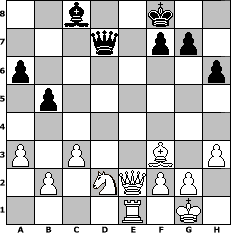 game notation in PGN-format [Event "Saphir"] [Site "www.myChess.de"] [Date "2021.05.11"] [Round "1"] [White "wolni55"] [Black "Master1"] [ECO "B11"] [WhitemyELO "1353"] [BlackmyELO "1273"] [Result "1-0"] [TimeControl "10/864000"] [WhiteDays "04"] [BlackDays "27"] [MyChessNo "122195"] 1. e4 c6 2. Nc3 d5 3. exd5 cxd5 4. d4 Nc6 5. h3 Nf6 6. Bg5 e5 7. dxe5 Nxe5 8. Bxf6 Qxf6 9. Qxd5 Bb4 10. Qb5+ Nc6 11. Nge2 O-O 12. a3 Bxc3+ 13. Nxc3 Re8+ 14. Be2 Kf8 15. O-O a6 16. Qh5 Nd4 17. Bd3 h6 18. Ne4 Nf5 19. c3 Qe6 20. Rfe1 Qd7 21. Rad1 Qc7 22. Nd2 Rxe1+ 23. Rxe1 Qd7 24. Qe2 b5 25. Bxf5 Qc6 26. Be4 Qe6 27. Bxa8 Qd7 28. Bf3 1-0 position notation in FEN-format 2b2k2/3q1pp1/p6p/1p6/8/P1P2B1P/1P1NQPP1/4R1K1 - - - 2 28 Captured white pieces: Captured black pieces: Click on a captured piece in order to display the desired move!