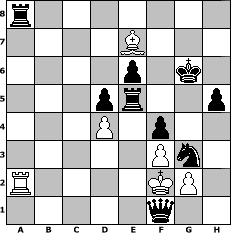game notation in PGN-format [Event "Vor dem Urlaub noch ein schnelles Turnier!"] [Site "www.myChess.de"] [Date "2012.06.16"] [Round "1"] [White "Winston"] [Black "Sanji"] [ECO "B20"] [WhitemyELO "1489"] [BlackmyELO "1547"] [Result "0-1"] [TimeControl "10/864000"] [WhiteDays "10"] [BlackDays "09"] [MyChessNo "82240"] 1. e4 c5 2. Bc4 Nc6 3. Nf3 e6 4. O-O a6 5. a3 b5 6. Ba2 Bb7 7. d3 Nf6 8. h3 Be7 9. Re1 O-O 10. c3 d5 11. e5 Nd7 12. d4 cxd4 13. cxd4 Re8 14. Nc3 b4 15. Ne2 bxa3 16. bxa3 Rc8 17. Ng3 Nf8 18. Be3 Ng6 19. Bb1 Na5 20. Bxg6 hxg6 21. h4 Bxh4 22. Nxh4 Qxh4 23. Rb1 Nc4 24. Rxb7 Nxa3 25. Rb2 Nc4 26. Ra2 a5 27. Qf3 Ra8 28. Nf1 a4 29. Qd1 a3 30. Bc1 f5 31. exf6 gxf6 32. Qd3 Kf7 33. Ng3 Rh8 34. Bxa3 f5 35. Raa1 f4 36. Qf3 Nd2 37. Qh5 gxh5 38. Nf1 Ne4 39. Re2 Rag8 40. f3 Ng3 41. Re5 Rg5 42. Bd6 Rxe5 43. Ra7+ Kg6 44. Ra2 Ra8 45. Be7 Qh1+ 46. Kf2 Qxf1# 0-1 position notation in FEN-format r7/4B3/4p1k1/3pr2p/3P1p2/5Pn1/R4KP1/5q2 - - - 0 47 Captured white pieces: Captured black pieces: Click on a captured piece in order to display the desired move!
