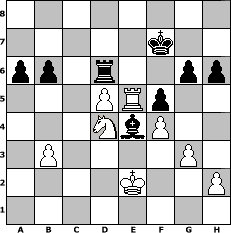 game notation in PGN-format [Event "7erD2"] [Site "www.myChess.de"] [Date "2011.10.14"] [Round "2"] [White "sprinterde"] [Black "Robert"] [ECO "B02"] [WhitemyELO "1678"] [BlackmyELO "1580"] [Result "1-0"] [TimeControl "10/3456000"] [WhiteDays "40"] [BlackDays "00"] [MyChessNo "76792"] 1. e4 Nf6 2. Nc3 e5 3. Bc4 Nc6 4. Nf3 d6 5. Ng5 d5 6. exd5 Na5 7. Qe2 Nxc4 8. Qxc4 Bd6 9. Nge4 Nxe4 10. Nxe4 Be7 11. d4 exd4 12. Qxd4 O-O 13. O-O f5 14. Ng3 Bd6 15. Bf4 Qf6 16. Qxf6 Rxf6 17. Bxd6 Rxd6 18. Rad1 Bd7 19. c4 b6 20. Rfe1 Kf7 21. Re5 g6 22. Rde1 Re8 23. f4 c6 24. Rxe8 Bxe8 25. Re5 cxd5 26. cxd5 Bb5 27. b3 Bd3 28. Kf2 Bb1 29. Ne2 Bxa2 30. Nd4 a6 31. Ke2 Bb1 32. Nf3 h6 33. Nd4 Be4 34. g3 1-0 position notation in FEN-format 8/5k2/pp1r2pp/3PRp2/3NbP2/1P4P1/4K2P/8 - - - 0 34 Captured white pieces: Captured black pieces: Click on a captured piece in order to display the desired move!