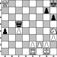 game notation in PGN-format [Event "Vierspringerspiel"] [Site "www.myChess.de"] [Date "2008.10.27"] [Round "1"] [White "Steppenwolf"] [Black "OwainGwynedd"] [ECO "C49"] [WhitemyELO "1261"] [BlackmyELO "1481"] [Result "1-0"] [TimeControl "10/2592000"] [WhiteDays "96"] [BlackDays "48"] [MyChessNo "49188"] 1. e4 e5 2. Nf3 Nc6 3. Nc3 Nf6 4. Bb5 Bb4 5. O-O O-O 6. d3 d6 7. Bg5 Ne7 8. Bxf6 Bxc3 9. Bxe7 Qxe7 10. bxc3 Bg4 11. d4 a6 12. Bc4 b5 13. Bb3 c6 14. h3 Bc8 15. Re1 a5 16. a4 Bb7 17. axb5 cxb5 18. Qd2 h6 19. Qd3 Qd7 20. dxe5 Rac8 21. exd6 Rfe8 22. c4 bxc4 23. Bxc4 Ra8 24. e5 Qc6 25. e6 fxe6 26. Bxe6+ Kh8 27. Qg6 Bc8 28. Bf5 Rxe1+ 29. Rxe1 Bxf5 30. Qxf5 Qxd6 31. c4 a4 32. Qe4 Qf8 33. Nh4 Qc5 34. Qxa8+ 1-0 position notation in FEN-format Q6k/6p1/7p/2q5/p1P4N/7P/4PPP1/4R1K1 - - - 0 34 Captured white pieces: Captured black pieces: Click on a captured piece in order to display the desired move!