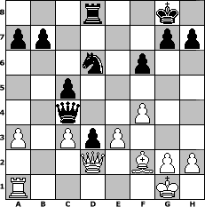 game notation in PGN-format [Event "Gary COME BACK Turnier"] [Site "www.myChess.de"] [Date "2005.03.18"] [Round "1"] [White "Sizilianer"] [Black "chessmike"] [ECO "A28"] [WhitemyELO "1530"] [BlackmyELO "1869"] [Result "0-1"] [TimeControl "10/1728000"] [WhiteDays "20"] [BlackDays "20"] [MyChessNo "11290"] 1. c4 e5 2. Nc3 Nc6 3. Nf3 Nf6 4. e3 Bb4 5. d3 e4 6. Nd4 O-O 7. Nxc6 dxc6 8. d4 c5 9. a3 Bxc3+ 10. bxc3 Bg4 11. Be2 Bxe2 12. Qxe2 c6 13. O-O Qa5 14. Bd2 Rad8 15. Rfe1 Rd6 16. f4 Rfd8 17. Reb1 R6d7 18. Be1 Ne8 19. Bh4 f6 20. Qc2 Nd6 21. d5 Qa6 22. dxc6 Qxc6 23. Qe2 Qa6 24. Rd1 Qxc4 25. Qc2 Nf5 26. Bf2 Rd3 27. Rxd3 exd3 28. Qd2 Nd6 0-1 position notation in FEN-format 3r2k1/pp4pp/3n1p2/2p5/2q2P2/P1PpP3/3Q1BPP/R5K1 - - - 2 29 Captured white pieces: Captured black pieces: Click on a captured piece in order to display the desired move!