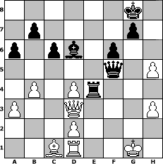 game notation in PGN-format [Event "M"] [Site "www.myChess.de"] [Date "2013.09.19"] [Round "1"] [White "Steffi"] [Black "Tomino"] [ECO "D10"] [WhitemyELO "1547"] [BlackmyELO "1706"] [Result "0-1"] [TimeControl "10/3456000"] [WhiteDays "40"] [BlackDays "40"] [MyChessNo "90341"] 1. d4 d5 2. c4 c6 3. e3 Bf5 4. Nc3 e6 5. Nf3 Nd7 6. Bd3 Bxd3 7. Qxd3 Ngf6 8. cxd5 exd5 9. O-O Bd6 10. h3 O-O 11. a3 Re8 12. Re1 a6 13. b4 Nb6 14. e4 dxe4 15. Nxe4 Nxe4 16. Rxe4 Qd7 17. Bb2 Rxe4 18. Qxe4 Re8 19. Qc2 h6 20. Rd1 Qe6 21. Ne5 Nd7 22. f4 f6 23. Nxd7 Qxd7 24. Qf2 Re4 25. Bc1 Qe6 26. g4 Re2 27. Qf3 Re1+ 28. Kf2 Re4 29. f5 Qa2+ 30. Kg1 Qd5 31. Qd3 h5 32. gxh5 Qxf5 0-1 position notation in FEN-format 6k1/1p4p1/p1pb1p2/5q1P/1P1Pr3/P2Q3P/3P4/2BR2K1 - - - 0 33 Captured white pieces: Captured black pieces: Click on a captured piece in order to display the desired move!