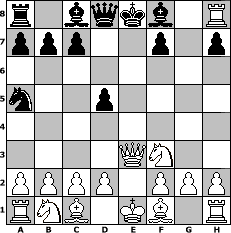 game notation in PGN-format [Event "Hertener Schachfreunde-Jahresstart"] [Site "www.myChess.de"] [Date "2012.02.01"] [Round "1"] [White "Robur"] [Black "micha62"] [ECO "B00"] [WhitemyELO "1778"] [BlackmyELO "1054"] [Result "1-0"] [TimeControl "10/2592000"] [WhiteDays "25"] [BlackDays "06"] [MyChessNo "79528"] 1. e4 Nc6 2. Nf3 Nf6 3. e5 d5 4. exf6 e5 5. fxg7 e4 6. gxh8=Q e3 7. Qe2 Na5 8. Qxe3+ 1-0 position notation in FEN-format r1bqkb1R/ppp2p1p/8/n2p4/8/4QN2/PPPP1PPP/RNB1KB1R - KQkq - 0 8 Captured white pieces: Captured black pieces: Click on a captured piece in order to display the desired move!