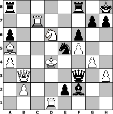 game notation in PGN-format [Event "Najdorf mit f4"] [Site "www.myChess.de"] [Date "2022.02.01"] [Round "2"] [White "alibengali"] [Black "Seneca"] [ECO "B93"] [WhitemyELO "1624"] [BlackmyELO "1533"] [Result "0-1"] [TimeControl "10/2592000"] [WhiteDays "93"] [BlackDays "97"] [MyChessNo "124523"] 1. e4 c5 2. Nf3 d6 3. d4 cxd4 4. Nxd4 Nf6 5. Nc3 a6 6. f4 e5 7. Nf5 Bxf5 8. exf5 e4 9. Nd5 Qa5+ 10. Nc3 d5 11. Bd2 Qb6 12. Be2 Bc5 13. Na4 Bf2+ 14. Kf1 Qc6 15. c4 e3 16. cxd5 Nxd5 17. Rc1 Qd7 18. Nc5 Qe7 19. Ba5 Nxf4 20. Nxb7 O-O 21. Rc7 Qe5 22. Qc2 Nxe2 23. Kxe2 Qb5+ 24. Kf3 Nd7 25. Rd1 Ne5+ 26. Kf4 f6 27. a4 Qe8 28. Nd6 Qh5 29. Qb3+ Kh8 30. h3 Qh4+ 31. g4 Qg3+ 32. Ke4 Qf3+ 33. Kd4 e2+ 0-1 position notation in FEN-format r4r1k/2R3pp/p2N1p2/B3nP2/P2K2P1/1Q3q1P/1P2pb2/3R4 - - - 0 34 Captured white pieces: Captured black pieces: Click on a captured piece in order to display the desired move!