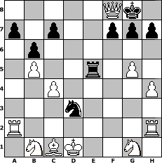 game notation in PGN-format [Event "READY TO RUMBLE!!!"] [Site "www.myChess.de"] [Date "2004.01.27"] [Round "1"] [White "Blacky"] [Black "Vouivre"] [ECO "A04"] [WhitemyELO "1493"] [BlackmyELO "1459"] [Result "1-0"] [TimeControl "10/3456000"] [WhiteDays "115"] [BlackDays "119"] [MyChessNo "2042"] 1. Nf3 Nc6 2. c3 e5 3. e4 Nf6 4. Bd3 d6 5. h3 Be6 6. b4 Qd7 7. b5 Na5 8. Qa4 b6 9. g4 Be7 10. g5 Nh5 11. h4 Nf4 12. Be2 Nxe2 13. Kxe2 Bc4+ 14. d3 Bxb5 15. Qb4 d5 16. Nxe5 dxe4 17. Qxe4 Qd8 18. a4 O-O 19. axb5 Bd6 20. f4 Re8 21. Kd1 Bxe5 22. fxe5 Nb3 23. Ra2 Nc5 24. Qe3 Qd5 25. Rhh2 Rxe5 26. c4 Qd6 27. Qf3 Nxd3 28. Qxa8+ Qf8 29. Qxf8+ 1-0 position notation in FEN-format 5Qk1/p1p2ppp/1p6/1P2r1P1/2P4P/3n4/R6R/1NBK2N1 - - - 0 29 Captured white pieces: ![]() ![]() ![]() ![]() ![]() ![]() ![]() ![]() ![]() ![]() ![]() ![]() ![]() ![]() ![]() Captured black pieces: ![]() ![]() ![]() ![]() ![]() ![]() ![]() ![]() ![]() ![]() ![]() ![]() ![]() ![]() ![]() Click on a captured piece in order to display the desired move!