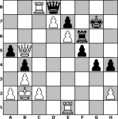 game notation in PGN-format [Event "April April April"] [Site "www.myChess.de"] [Date "2016.04.15"] [Round "1"] [White "Joschi"] [Black "mudb"] [Variant "Fischerrandom"] [SetUp "1"] [FEN "rqnnkrbb/pppppppp/8/8/8/8/PPPPPPPP/RQNNKRBB w KQkq - 0 1"] [WhitemyELO "1522"] [BlackmyELO "1065"] [Result "1-0"] [TimeControl "10/2592000"] [WhiteDays "120"] [BlackDays "084"] [MyChessNo "103296"] 1. Nc3 c6 2. d4 g6 3. f3 Ne6 4. e3 Nd6 5. Nd3 f6 6. b3 b6 7. Qd1 a6 8. Qd2 Bg7 9. O-O-O Bh6 10. Kb2 a5 11. Qe2 b5 12. e4 b4 13. Na4 Nf4 14. Nxf4 Bxf4 15. g3 Bg5 16. f4 Bh6 17. Nc5 Be6 18. Nxe6 dxe6 19. e5 fxe5 20. Bxc6+ Kf7 21. fxe5+ Nf5 22. Bxa8 Qxa8 23. g4 Qd8 24. gxf5 exf5 25. Qc4+ Ke8 26. d5 Bg7 27. Bd4 h5 28. e6 Bxd4+ 29. Rxd4 Rf6 30. Qb5+ Kf8 31. Re1 g5 32. d6 Kg7 33. d7 h4 34. Rc4 g4 35. Rc8 1-0 position notation in FEN-format 2Rq4/3Pp1k1/4Pr2/pQ3p2/1p4pp/1P6/PKP4P/4R3 - - - 1 35 Captured white pieces: ![]() ![]() ![]() ![]() ![]() ![]() ![]() ![]() ![]() ![]() ![]() ![]() ![]() ![]() ![]() Captured black pieces: ![]() ![]() ![]() ![]() ![]() ![]() ![]() ![]() ![]() ![]() ![]() ![]() ![]() ![]() ![]() Click on a captured piece in order to display the desired move!