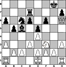 game notation in PGN-format [Event "Albspiele 11"] [Site "www.myChess.de"] [Date "2011.02.24"] [Round "1"] [White "Winston"] [Black "Steppenwolf"] [ECO "C44"] [WhitemyELO "1440"] [BlackmyELO "1160"] [Result "1-0"] [TimeControl "10/1728000"] [WhiteDays "20"] [BlackDays "11"] [MyChessNo "72279"] 1. e4 e5 2. Nf3 Nc6 3. a3 Bc5 4. Nc3 Nf6 5. h3 O-O 6. Bc4 d6 7. d3 Re8 8. Bg5 Be6 9. Bxf6 Qxf6 10. Bd5 Rad8 11. Qd2 a6 12. Ng5 Bxd5 13. Nxd5 Qh6 14. Nxc7 Rd7 15. Nxe8 f6 16. Nxf6+ gxf6 17. Nf3 b5 18. Qxh6 1-0 position notation in FEN-format 6k1/3r3p/p1np1p1Q/1pb1p3/4P3/P2P1N1P/1PP1PPP1/R3K2R - KQ - 0 18 Captured white pieces: Captured black pieces: Click on a captured piece in order to display the desired move!