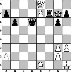game notation in PGN-format [Event "QGD (D37)"] [Site "www.myChess.de"] [Date "2005.02.20"] [Round "2"] [White "Juliette2103"] [Black "Zoltan"] [ECO "D37"] [WhitemyELO "1797"] [BlackmyELO "1757"] [Result "1-0"] [TimeControl "10/1728000"] [WhiteDays "96"] [BlackDays "86"] [MyChessNo "10519"] 1. d4 d5 2. c4 e6 3. Nc3 Nf6 4. Nf3 Be7 5. Bf4 O-O 6. e3 c6 7. Bd3 Nbd7 8. cxd5 Nxd5 9. Bg3 N7f6 10. O-O Re8 11. e4 Nxc3 12. bxc3 c5 13. Qc2 Nh5 14. e5 g6 15. Be4 Nxg3 16. fxg3 Qc7 17. Qf2 Rb8 18. Rac1 b6 19. Qe2 Rd8 20. Rc2 Bb7 21. Nd2 Rbc8 22. Qf3 Bxe4 23. Qxf7+ Kh8 24. Nxe4 cxd4 25. Qxe6 d3 26. Rcf2 Bc5 27. Nxc5 Qxc5 28. Qf6+ Kg8 29. Kh1 d2 30. Rd1 Rf8 31. Qe6+ Kh8 32. Rdxd2 Qxc3 33. Rxf8+ Rxf8 34. Rd1 Qd3 35. Rg1 Rf1 36. h3 Rf5 37. Qe8+ Kg7 38. e6 Qd6 39. e7 Rf7 40. Re1 1-0 position notation in FEN-format 4Q3/p3Prkp/1p1q2p1/8/8/6PP/P5P1/4R2K - - - 2 40 Captured white pieces: ![]() ![]() ![]() ![]() ![]() ![]() ![]() ![]() ![]() ![]() ![]() ![]() ![]() ![]() ![]() Captured black pieces: ![]() ![]() ![]() ![]() ![]() ![]() ![]() ![]() ![]() ![]() ![]() ![]() ![]() ![]() ![]() Click on a captured piece in order to display the desired move!
