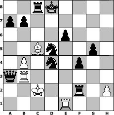 game notation in PGN-format [Event "Albspiele 15"] [Site "www.myChess.de"] [Date "2011.08.25"] [Round "1"] [White "Hobbykegler"] [Black "faustballer"] [Variant "Fischerrandom"] [SetUp "1"] [FEN "rnqknbbr/pppppppp/8/8/8/8/PPPPPPPP/RNQKNBBR w KQkq - 0 1"] [WhitemyELO "1051"] [BlackmyELO "1485"] [Result "0-1"] [TimeControl "10/1728000"] [WhiteDays "18"] [BlackDays "20"] [MyChessNo "75755"] 1. f3 g5 2. g4 f6 3. e4 Bg7 4. d4 h5 5. Bh3 hxg4 6. Bxg4 Nc6 7. c3 Bf7 8. Nd3 e6 9. Be3 Ne7 10. Qc2 Bg6 11. Na3 Nd6 12. O-O-O f5 13. exf5 exf5 14. Bh3 Rxh3 15. Ne5 Bxe5 16. dxe5 f4 17. Bd4 Bxc2 18. Nxc2 Nb5 19. Rhe1 c5 20. Bf2 Qc6 21. b4 cxb4 22. cxb4 Rc8 23. Rd2 Rxf3 24. Kd1 Nc3+ 25. Kc1 Qa4 26. Bc5 Ned5 27. e6 dxe6 28. Nd4 Qa3+ 29. Rb2 Nxa2+ 30. Kb1 Nac3+ 31. Kc2 Rf2+ 32. Ne2 Nxe2 33. Rb3 Nd4+ 0-1 position notation in FEN-format 2rk4/pp6/4p3/2Bn2p1/1P1n1p2/qR6/2K2r1P/4R3 - - - 2 34 Captured white pieces: Captured black pieces: Click on a captured piece in order to display the desired move!