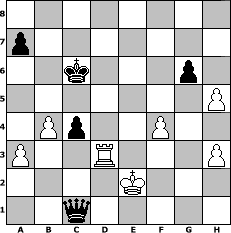game notation in PGN-format [Event "Energiekrise"] [Site "www.myChess.de"] [Date "2022.10.29"] [Round "1"] [White "Lohl"] [Black "lotchi"] [ECO "C40"] [WhitemyELO "1388"] [BlackmyELO "1243"] [Result "0-1"] [TimeControl "10/1728000"] [WhiteDays "20"] [BlackDays "20"] [MyChessNo "127804"] 1. e4 e5 2. Nf3 f6 3. Nxe5 fxe5 4. Qh5+ g6 5. Qxe5+ Ne7 6. Qxh8 d5 7. Bb5+ c6 8. Ba4 dxe4 9. Nc3 Bf5 10. O-O Nd7 11. d3 exd3 12. Bh6 Qc7 13. Rfe1 O-O-O 14. Bxf8 Nxf8 15. cxd3 Kb8 16. Qe5 Qxe5 17. Rxe5 Nc8 18. Bc2 Kc7 19. Re1 Bxd3 20. Bxd3 Rxd3 21. Rd1 Rxd1+ 22. Nxd1 Kd7 23. Re3 Ne6 24. Rh3 h5 25. Rd3+ Nd6 26. g3 c5 27. b3 Nd4 28. Ne3 Kc6 29. Kg2 b5 30. b4 Nc4 31. a3 Nb2 32. Rd2 Na4 33. f4 Nb6 34. h3 Nc4 35. Nxc4 bxc4 36. g4 c3 37. Rd3 Ne2 38. Kf3 c2 39. Kxe2 c1=Q 40. gxh5 c4 0-1 position notation in FEN-format 8/p7/2k3p1/7P/1Pp2P2/P2R3P/4K3/2q5 - - - 0 41 Captured white pieces: Captured black pieces: Click on a captured piece in order to display the desired move!