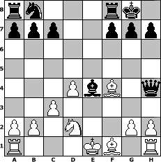 game notation in PGN-format [Event "unter uns Nr. 17"] [Site "www.myChess.de"] [Date "2014.02.13"] [Round "1"] [White "Caligula"] [Black "Haneken"] [ECO "C35"] [WhitemyELO "1474"] [BlackmyELO "1030"] [Result "0-1"] [TimeControl "10/864000"] [WhiteDays "19"] [BlackDays "16"] [MyChessNo "92904"] 1. e4 e5 2. f4 exf4 3. Nf3 Be7 4. d4 Nf6 5. e5 Ne4 6. Qe2 d5 7. exd6 Nxd6 8. Bxf4 Bf5 9. Nc3 O-O 10. Qf2 Ne4 11. Nxe4 Bxe4 12. c3 Bf6 13. Nd2 Bh4 14. Qxh4 Qxh4+ 0-1 position notation in FEN-format rn3rk1/ppp2ppp/8/8/3PbB1q/2P5/PP1N2PP/R3KB1R - KQ - 0 15 Captured white pieces: Captured black pieces: Click on a captured piece in order to display the desired move!