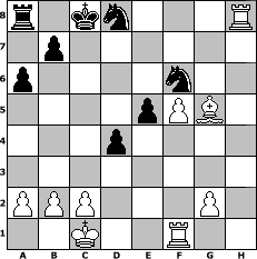 game notation in PGN-format [Event "Sommerrunden"] [Site "www.myChess.de"] [Date "2005.05.30"] [Round "1"] [White "PluckyDuck"] [Black "Caligula"] [ECO "D00"] [WhitemyELO "1542"] [BlackmyELO "1611"] [Result "1-0"] [TimeControl "10/1728000"] [WhiteDays "19"] [BlackDays "20"] [MyChessNo "13706"] 1. d4 d5 2. e4 dxe4 3. Nc3 c5 4. Nxe4 Qxd4 5. Qxd4 cxd4 6. Nf3 Nc6 7. Bd2 a6 8. O-O-O e5 9. Bc4 Nge7 10. Nd6+ Kd7 11. Nxf7 Ng6 12. Nxh8 Nxh8 13. Ng5 Ke7 14. Nxh7 Ng6 15. Nxf8 Nxf8 16. Bg5+ Ke8 17. h4 Be6 18. Bxe6 Nxe6 19. Bd2 Nc5 20. h5 Ne4 21. h6 gxh6 22. Rxh6 Kd7 23. f4 Nf2 24. Rf1 Ng4 25. Rh7+ Kc8 26. f5 Nf6 27. Rh8+ Nd8 28. Bg5 1-0 position notation in FEN-format r1kn3R/1p6/p4n2/4pPB1/3p4/8/PPP3P1/2K2R2 - - - 4 28 Captured white pieces: ![]() ![]() ![]() ![]() ![]() ![]() ![]() ![]() ![]() ![]() ![]() ![]() ![]() ![]() ![]() Captured black pieces: ![]() ![]() ![]() ![]() ![]() ![]() ![]() ![]() ![]() ![]() ![]() ![]() ![]() ![]() ![]() Click on a captured piece in order to display the desired move!