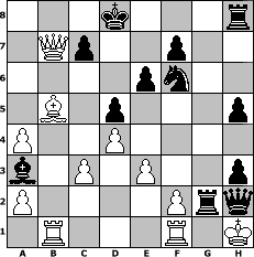 game notation in PGN-format [Event "O, Du fröhlische"] [Site "www.myChess.de"] [Date "2018.11.26"] [Round "2"] [White "Haneken"] [Black "wolni55"] [ECO "A06"] [WhitemyELO "1079"] [BlackmyELO "1333"] [Result "0-1"] [TimeControl "10/2592000"] [WhiteDays "66"] [BlackDays "73"] [MyChessNo "113543"] 1. Nf3 d5 2. Nc3 Nf6 3. Ne5 e6 4. e3 a6 5. b3 Bd6 6. Nd3 Bd7 7. Be2 Nc6 8. Bf3 Ne5 9. Nxe5 Bxe5 10. d4 Bd6 11. Na4 Bxa4 12. bxa4 Qd7 13. c3 O-O-O 14. h3 h5 15. O-O Rdg8 16. Qb3 g5 17. Ba3 g4 18. Be2 gxh3 19. Rab1 Bxa3 20. Bxa6 Qd6 21. Qxb7+ Kd8 22. Bb5 Rxg2+ 23. Kh1 Qh2# 0-1 position notation in FEN-format 3k3r/1Qp2p2/4pn2/1B1p3p/P2P4/b1P1P2p/P4Prq/1R3R1K - - - 2 24 Captured white pieces: Captured black pieces: Click on a captured piece in order to display the desired move!