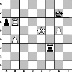 game notation in PGN-format [Event "MN-2012-3"] [Site "www.myChess.de"] [Date "2012.12.01"] [Round "1"] [White "Erich"] [Black "Grubengeist"] [ECO "C41"] [WhitemyELO "1983"] [BlackmyELO "1962"] [Result "1/2-1/2"] [TimeControl "10/2592000"] [WhiteDays "30"] [BlackDays "26"] [MyChessNo "85252"] 1. e4 e5 2. Nf3 d6 3. d4 exd4 4. Nxd4 Nf6 5. Nc3 Be7 6. Be2 O-O 7. O-O Re8 8. Bf4 Bf8 9. f3 Nc6 10. Re1 a6 11. Qd2 Ne5 12. Rad1 Bd7 13. Bg5 h6 14. Bxf6 Qxf6 15. f4 Nc6 16. Nf3 Rad8 17. a3 Ne7 18. g3 Bh3 19. Bf1 Bg4 20. Bg2 g6 21. h3 Bxf3 22. Bxf3 Bg7 23. Kg2 Qe6 24. Re3 b5 25. Rde1 h5 26. Rd3 Rb8 27. b3 Qc8 28. Ne2 Rb7 29. g4 hxg4 30. hxg4 Rb6 31. Rh1 Qe6 32. g5 Rbb8 33. Nc3 Rb6 34. Nd1 f5 35. exf5 Qxf5 36. Ne3 Qxf4 37. Nd5 Qxd2+ 38. Rxd2 Nf5 39. Nxb6 cxb6 40. Rd3 Re7 41. c3 Be5 42. Bg4 Rc7 43. Rf1 Rf7 44. Bxf5 gxf5 45. Rdf3 Rc7 46. Rc1 Rh7 47. Rxf5 Rh2+ 48. Kf3 Rb2 49. b4 Ra2 50. c4 bxc4 51. Rxc4 Kg7 52. Kg4 Kg6 53. Rxe5 dxe5 54. Rc6+ Kg7 55. Kf5 Rxa3 56. Rxb6 Rf3+ 57. Kxe5 1/2-1/2 position notation in FEN-format 8/6k1/pR6/4K1P1/1P6/5r2/8/8 - - - 0 57 Captured white pieces: Captured black pieces: Click on a captured piece in order to display the desired move!