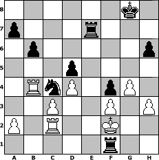 game notation in PGN-format [Event "LASKER 2016/1916"] [Site "www.myChess.de"] [Date "2016.10.26"] [Round "1"] [White "sprinterde"] [Black "Robur"] [ECO "D57"] [WhitemyELO "1703"] [BlackmyELO "1828"] [Result "0-1"] [TimeControl "10/2592000"] [WhiteDays "120"] [BlackDays "040"] [MyChessNo "105392"] 1. d4 d5 2. c4 e6 3. Nc3 Nf6 4. Bg5 Be7 5. e3 O-O 6. Nf3 h6 7. Bh4 Ne4 8. Bxe7 Qxe7 9. cxd5 Nxc3 10. bxc3 exd5 11. Qb3 c6 12. Bd3 Nd7 13. O-O Nf6 14. Rab1 b6 15. Ne5 Ng4 16. Nf3 Be6 17. h3 Nf6 18. Rfd1 Nd7 19. Rb2 c5 20. Bb5 c4 21. Qb4 Qxb4 22. Rxb4 Nf6 23. Nd2 Bf5 24. Rc1 Rfc8 25. Ba4 Rc7 26. Bc2 Bd3 27. Bxd3 cxd3 28. f3 Re8 29. Kf2 Re6 30. Rb3 Rce7 31. Nf1 Ne8 32. Rd1 Nd6 33. Rxd3 f5 34. g3 g5 35. g4 f4 36. exf4 gxf4 37. Rd2 Nc4 38. Rc2 Re1 39. Rb4 Rxf1+ 0-1 position notation in FEN-format 6k1/p3r3/1p5p/3p4/1RnP1pP1/2P2P1P/P1R2K2/5r2 - - - 0 40 Captured white pieces: Captured black pieces: Click on a captured piece in order to display the desired move!