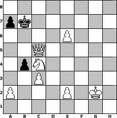 game notation in PGN-format [Event "1.Chess in Friendship"] [Site "www.myChess.de"] [Date "2004.08.10"] [Round "1"] [White "Master1"] [Black "Evilduff"] [ECO "C41"] [WhitemyELO "1186"] [BlackmyELO "1500"] [Result "1-0"] [TimeControl "10/2592000"] [WhiteDays "149"] [BlackDays "148"] [MyChessNo "6074"] 1. e4 e5 2. Nf3 d6 3. d4 c5 4. dxe5 Qa5+ 5. c3 Qb6 6. Bc4 dxe5 7. Ng5 Be6 8. Nxe6 fxe6 9. Qh5+ g6 10. Qxe5 Bh6 11. Qxh8 Bxc1 12. Qxg8+ Kd7 13. Qxh7+ Kd6 14. Qxg6 Bxb2 15. Qxe6+ Kc7 16. Qe7+ Nd7 17. Be6 Rd8 18. O-O Qd6 19. Qxd6+ Kxd6 20. Bxd7 Rxd7 21. Rd1+ Ke6 22. Rxd7 Kxd7 23. h4 Ke7 24. g4 Bxa1 25. f4 Bb2 26. f5 Bc1 27. g5 Bf4 28. f6+ Kf7 29. Na3 Kg6 30. Kg2 Kh5 31. Nc4 Kxh4 32. g6 Bh6 33. g7 Kg5 34. g8=Q+ Kxf6 35. e5+ Ke7 36. Qh7+ Kd8 37. Qxh6 b5 38. Qf6+ Kc7 39. Qd6+ Kb7 40. e6 b4 41. Qxc5 1-0 position notation in FEN-format 8/pk6/4P3/2Q5/1pN5/2P5/P3P1K1/8 - - - 0 41 Captured white pieces: Captured black pieces: Click on a captured piece in order to display the desired move!