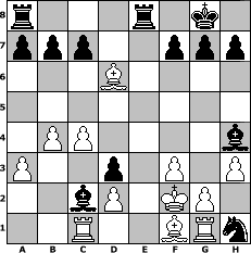 game notation in PGN-format [Event "Svetlana Open 2012"] [Site "www.myChess.de"] [Date "2012.03.22"] [Round "1"] [White "Neo111"] [Black "ClaudiaN"] [ECO "C44"] [WhitemyELO "1132"] [BlackmyELO "1871"] [Result "0-1"] [TimeControl "10/2592000"] [WhiteDays "26"] [BlackDays "29"] [MyChessNo "80779"] 1. e4 e5 2. Nf3 Nc6 3. a3 Nf6 4. Qe2 Bc5 5. h3 O-O 6. Nc3 d5 7. Qd3 Nd4 8. Nxd4 exd4 9. Nxd5 Nxe4 10. b4 Qxd5 11. c4 Qf5 12. f3 Ng3 13. Qxf5 Bxf5 14. Rg1 Be7 15. Bb2 Bc2 16. Rc1 d3 17. Be5 Bh4 18. Bd6 Rfe8+ 19. Kf2 Nh1# 0-1 position notation in FEN-format r3r1k1/ppp2ppp/3B4/8/1PP4b/P2p1P1P/2bP1KP1/2R2BRn - - - 6 20 Captured white pieces: ![]() ![]() ![]() ![]() ![]() ![]() ![]() ![]() ![]() ![]() ![]() ![]() ![]() ![]() ![]() Captured black pieces: ![]() ![]() ![]() ![]() ![]() ![]() ![]() ![]() ![]() ![]() ![]() ![]() ![]() ![]() ![]() Click on a captured piece in order to display the desired move!
